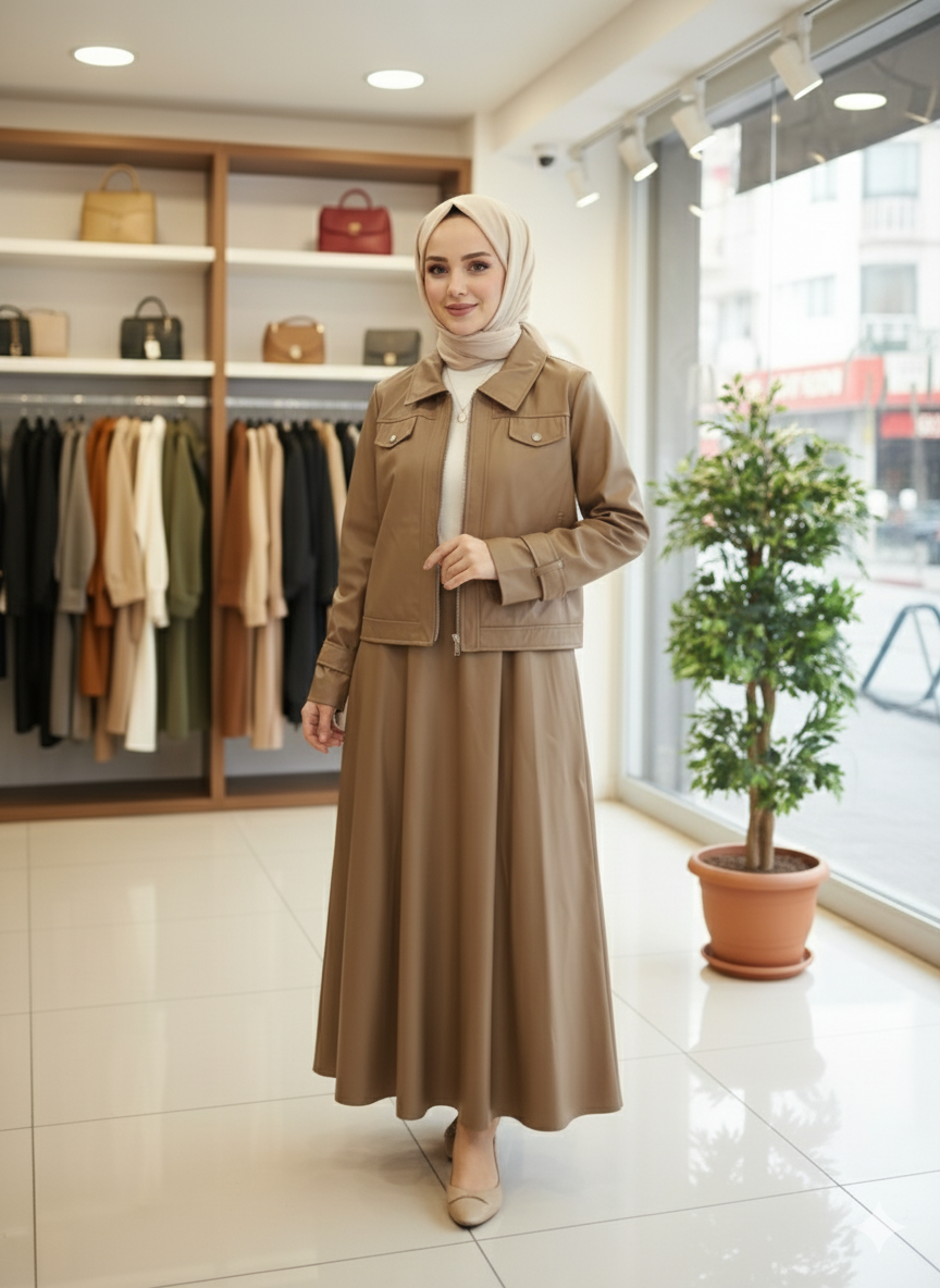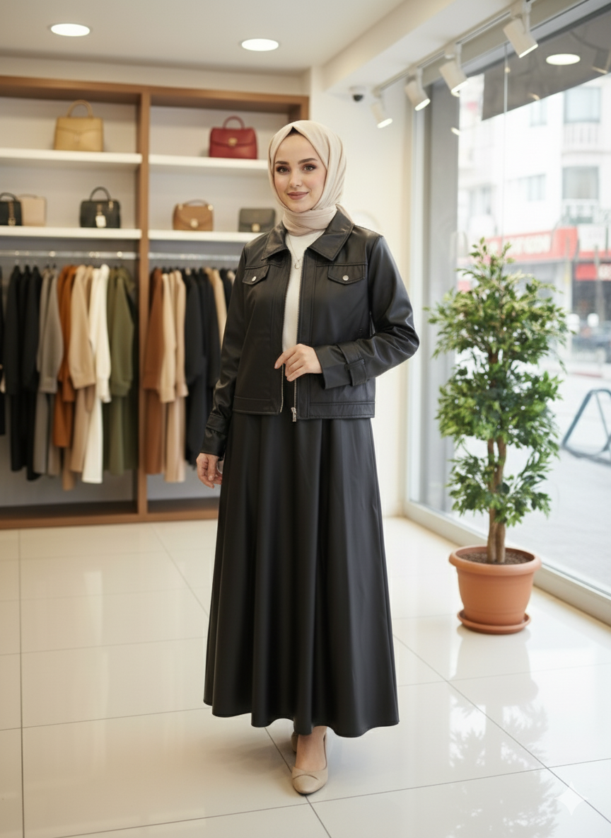 Bu takım, iş yemeğinden özel bir davete, günlük hayattan gece gezmelerine kadar her türlü etkinlikte rahatlıkla kullanılabilir. Kış aylarında sıcak tutan yapısı ile hem estetik hem de işlevsel bir tercih sunar. Deri Etekli Takım'ı, topuklu ayakkabılarla veya şık botlarla kombinleyerek stilinizi tamamlayabilirsiniz.