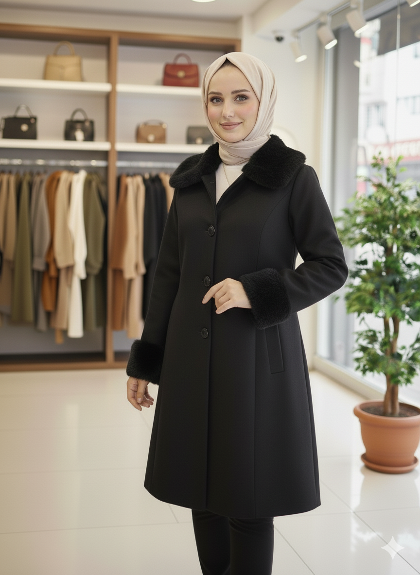 - Detaylar: kürk yaka, düğme kapama ve bilek kürklü