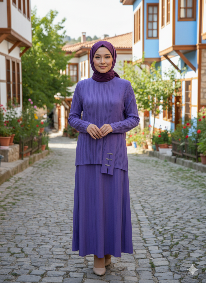 Merserize Toka Detaylı Etekli Takım, zarif toka detayı ile modern bir dokunuş kazanıyor. Toka kısmı, hem işlevsellik hem de estetik açıdan öne çıkıyor ve kombininizle uyumlu bir bütünlük sağlıyor. Etek kısmı ise, tam bel hizasında başlayarak vücut hatlarınızı nazikçe vurgulayan bir desende tasarlanmıştır. Etek uzunluğu diz hizasında olup, ferahlığı ve hareket özgürlüğünü maksimumda tutar.